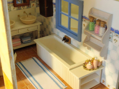 These are the pics to show how I am thinking to do the bathroom. Nothing is still glue in place, the floor isn´t finished yet. I don´t know if the mirror frames will be painted in blue as the other piece of furniture in the right wall...