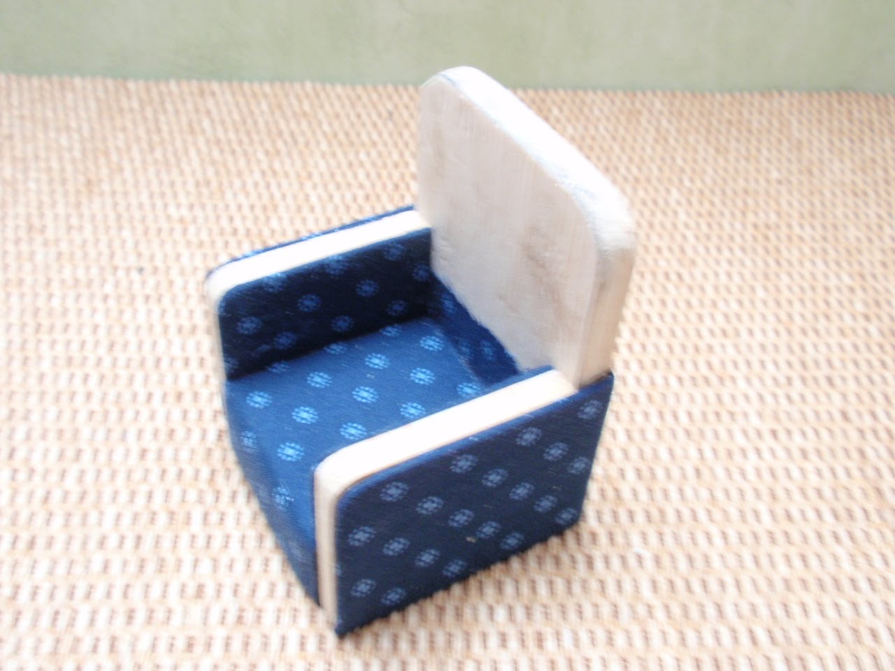 This is an upholstered chair that I made based in patterns from a Japanese dollshouse book. I am not very happy with the final result, but I have learned a lot! One thing I learned is that is very difficult, almost impossible (at least for me) to get ride of the ruffles in the back chair, because the seat is round, I tried to strech the fabric as much as possible, but the result is always the same, ruffles!!!!!!!!!!!! so, now i am trying to make another kind of upholstered chair, complete different design....